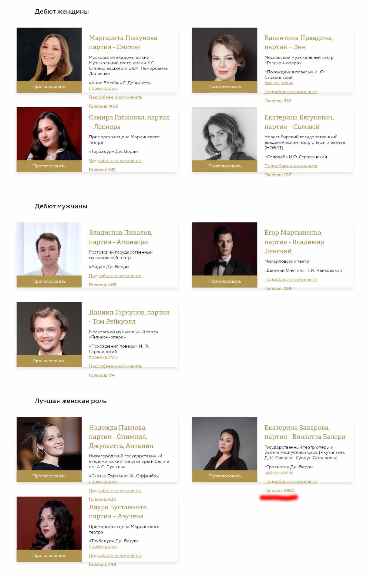 Co-founder of the Onegin National Opera Award Ljuba Glazkova said that only one nominee in each category can win the coveted Onegin Award, but absolutely every one of them deserves the audience's admiration and respect. Let the Expert Board choose the nominees that displayed their potential to the fullest degree and gave something fresh and new to the art of opera. But the audience chooses the artists that they loved, that captivated them and that brought them joy with their performances. In theatres, audiences vote with their applause, but on the internet, they vote with their likes. Now your vote counts too!