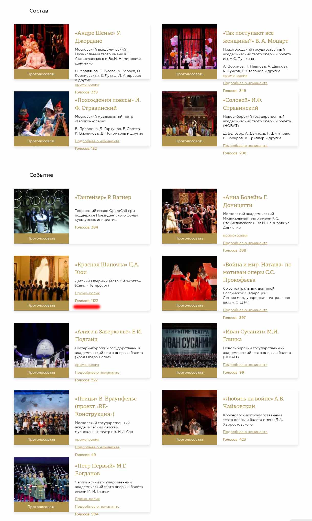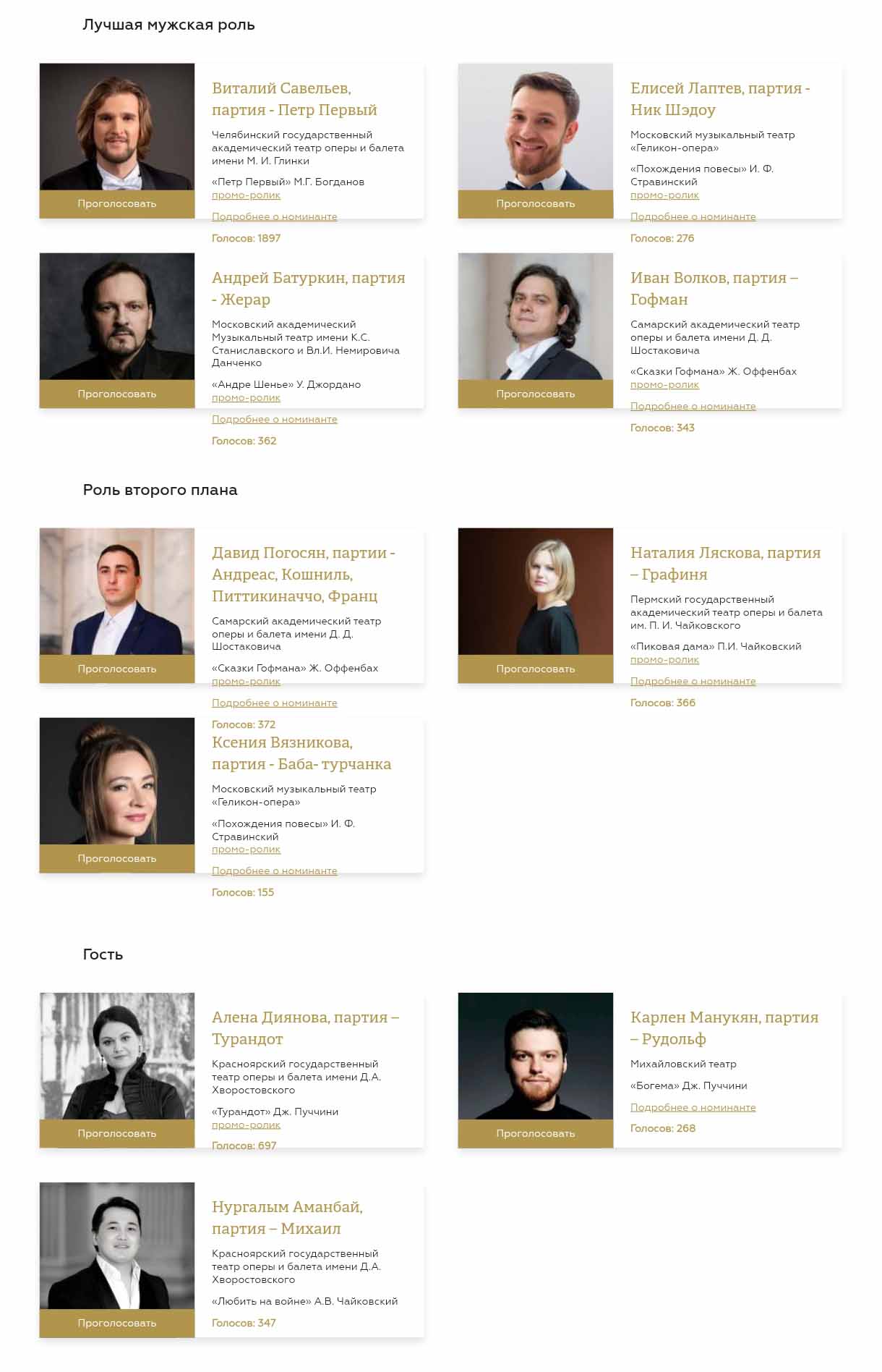 The voting process will continue till November 28th, and on November 29th during the X Onegin National Opera Award Ceremony winners of the Audience Choice Award will be announced alongside the winners of each of the regular categories. An artist and a play that received the most votes will be presented with a special “Favorite” award.